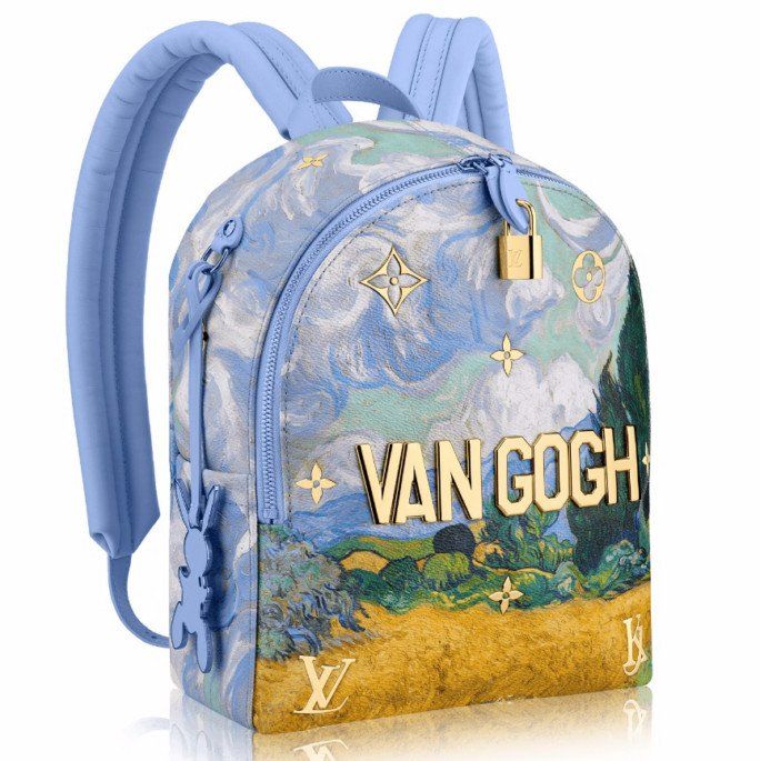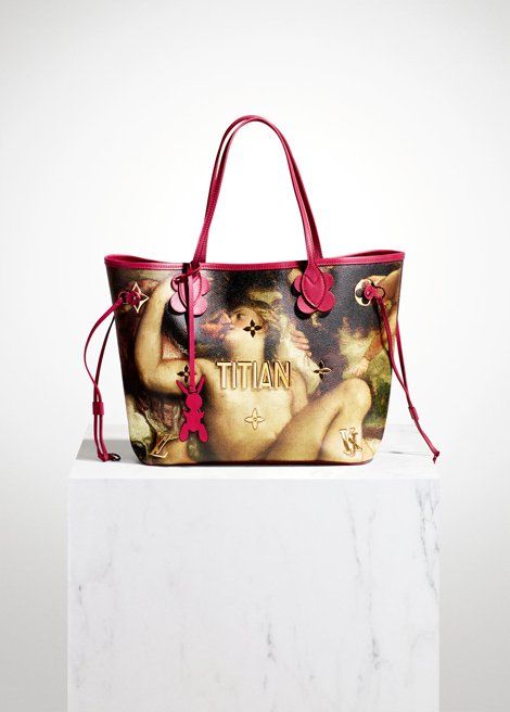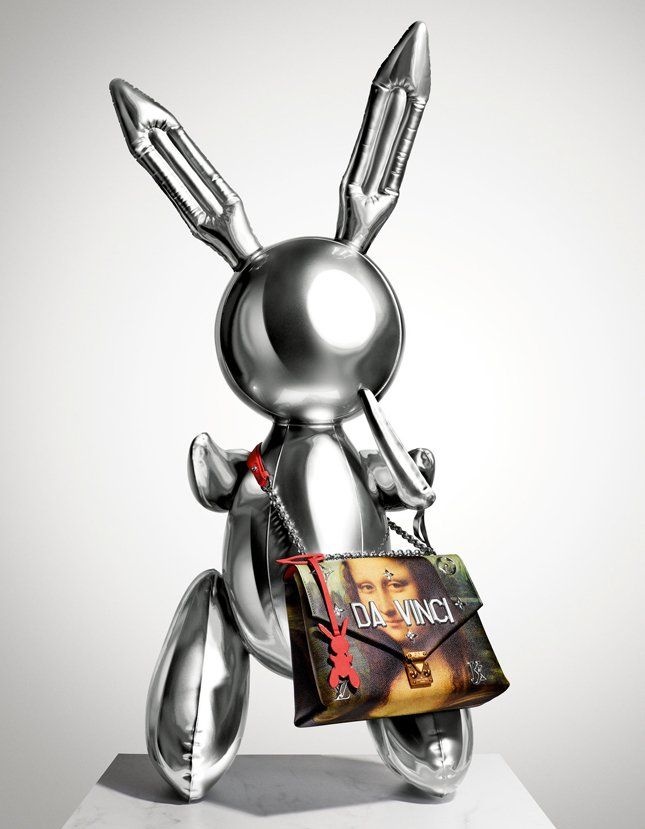 Своеобразным продолжением этой серии и стала коллекция, созданная Кунсом совместно с Louis Vuitton. Для французского Дома художник выбрал еще пять шедевров мировой живописи: «Джоконду» да Винчи, «Пшеничное поле с кипарисами» Ван Гога, «Охоту на тигров и львов» Рубенса, «Марса, Венеру и Амура» Тициана и «Девушку, играющую с собачкой» Фрагонара и перенес их на классические аксессуары Louis Vuitton - всего 51 предмет. В коллекцию вошли модели сумок Speedy, Keepall и Neverfull, а также шарфы, брелоки, кошельки и чехлы для ноутбуков. Каждая сумка декорирована полированными металлическими буквами с именем автора картины, по углам расположились монограммы Louis Vuitton и Джеффа Кунса, а традиционный брелок с буквами LV заменил силуэт кунсовского надувного зайчика.